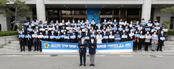 경기도의회 교섭단체 더불어민주당(대표의원 박근철, 의왕1)은 13일 의원총회가 끝난 후 의회 현관 앞에서 ‘미얀마 사태 해결 촉구 결의대회’를 개최했다.