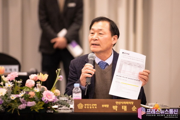 ▲14일 양평군 ‘소노휴 양평’에서 진행된 경기도시군의회의장협의회 제175차 정례회의에 참석한 안산시의회 박태순 의장의 모습.(사진=안산시의회) |
