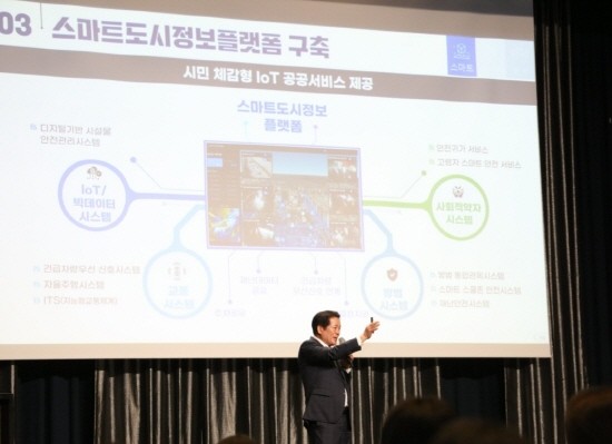 | ▲최대호 안양시장이 지난 15일 워크숍에서 사회복지종사자에게 시정 운영계획과 복지정책 방향을 설명하고 있다.(사진=안양시) |