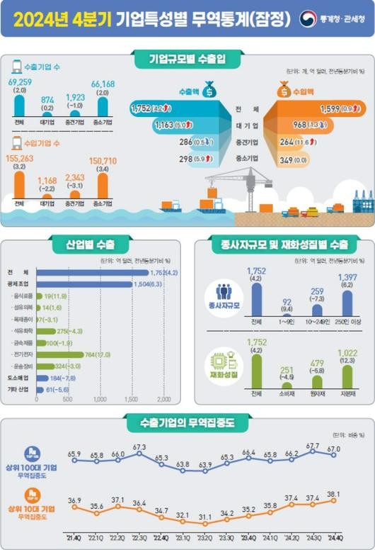 지난해 4분기 수출액은 1752억 달러(4.2%), 수입액은 1599억 달러(0.9%)로 증가했다. 대기업(1163억 달러, 5.0%)과 중소기업(298억 달러, 5.9%)은 증가했으나, 중견기업은 286억 달러로 0.5% 감소했다. 수입액은 대기업이 968억 달러로 1.3% 감소했지만, 중견기업은 264억 달러로 11.6% 증가했다. 중소기업은 보합세를 기록했다.