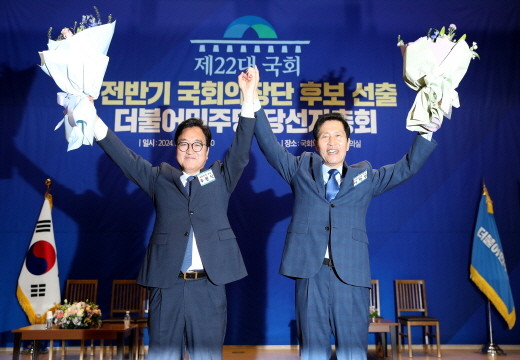 | ▲더불어민주당 국회의장 후보로 당선된 우원식 의원이 16일 서울 여의도 국회 의원회관에서 열린 제22대 국회 전반기 국회의장단 후보 선출을 위한 더불어민주당 당선자총회에서 이학영 국회부의장 후보와 꽃다발을 들고 기념촬영을 하고 있다.(사진= 뉴스1) |