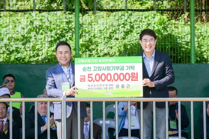 [전남=프레스뉴스] 강래성 기자= 순천시(시장 노관규)는 지난 9일 서울 관악구민운동장에서 열린 (사)재경순천애향회 행사에서 재경순천향우회 윤홍근 회장(제너시스BBQ 회장)과 고향사랑기부금 500만원 기탁식을 가졌다.