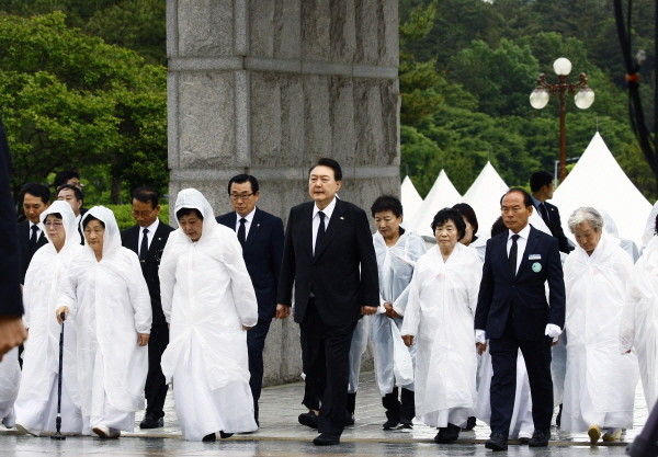| ▲ 윤석열 대통령이 18일 오전 국립5·18민주묘지에서 열린 제43주년 5·18민주화운동 기념식에 오월어머니들과 함께 민주의 문을 통해 입장하고 있다.(사진=뉴스1) |