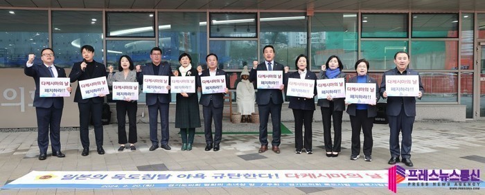 [프레스뉴스] 류현주 기자= 경기도의회 독도사랑·국토사랑회(회장 김용성 의원)는 20일, 경기도의회 ‘평화의 소녀상’ 앞에서 일본의 ‘다케시마의 날’ 폐지를 촉구하는 성명서를 발표했다.