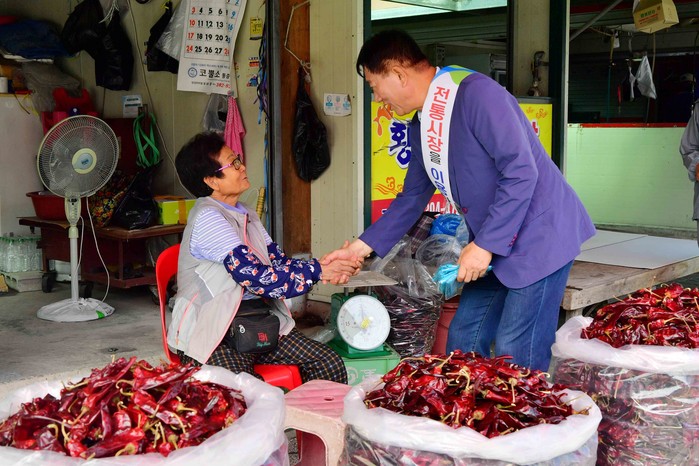 | ▲장성군이 하반기 34개 소상공인 점포를 지원한다. 지난 9월 황룡시장을 찾은 김한종 장성군수(사진제공=장성군) |