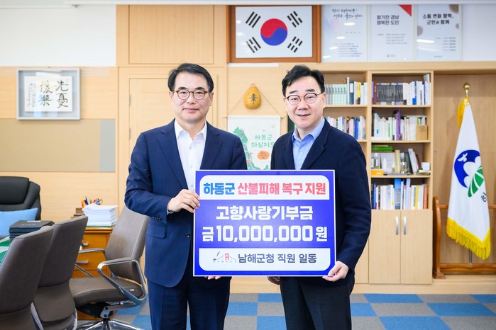남해군은 최근 하동군에 발생한 산불 피해에 깊은 위로의 뜻을 전하며, 조속한 복구를 응원하기 위해 고향사랑기부금을 전달하게 됐다. 또한 지난 3월부터 남해군 내 각 기관과 단체에서도 하동군 산불 피해 주민들을 돕기 위한 구호물품과 성금 지원이 이어지고 있다.