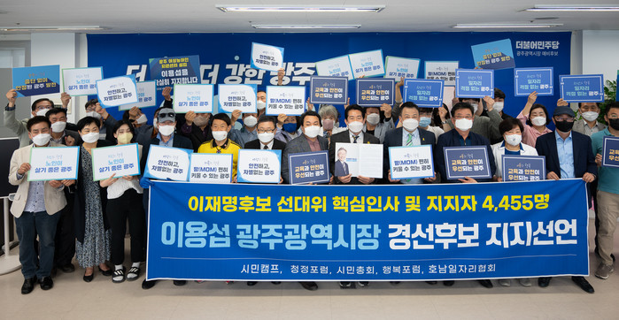 [광주=프레스뉴스] 강래성 기자= 19일 오전 11시, 지난 대선에서 이재명후보 선대위를 이끌었던 핵심인사들과 지지자 4,455명이 이용섭 광주광역시장 경선후보 지지를 선언했다.