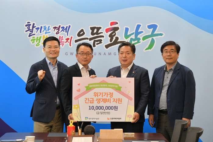 [광주=프레스뉴스] 강래성 기자= 신용회복위원회 광주전남제주 본부는 남구 관내 조선가정 및 소년소녀가정 등 위기가정 지원을 위해 남구청에 긴급 생계비 1,000만원을 후원했다.