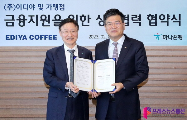 [프레스뉴스] 김대일 기자= 하나은행(은행장 이승열)은 지난 1일 오후 서울 중구 을지로 하나은행 본점에서 대한민국 대표 커피 브랜드 기업 이디야커피(회장 문창기)와 가맹점 금융지원 등을 위한 상생 업무협약(MOU)을 체결했다고 밝혔다.