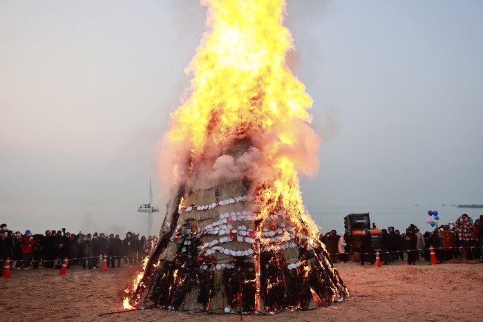 | ▲보성군, 정월대보름 세시풍속 행사 풍성(2023.1.1 새해 해맞이 행사에서 소원 달집 태우기 행사)/보성군 제공 |