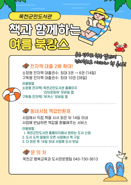[프레스뉴스] 류현주 기자= 옥천군민도서관이 여름휴가 시즌을 맞아 군민들이 언제 어디서나 책과 함께 특별한 ‘북캉스’를 즐길 수 있도록 비대면 독서 서비스를 대폭 강화한다.
