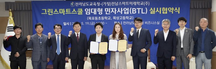 [전남=프레스뉴스] 강래성 기자= 전라남도교육청이 19일(금) 청사 5층 비즈니스실에서 (가칭)전남스마트미래학교(주)와 목포동초등학교·목상고등학교에 대한 ‘그린스마트 미래학교 임대형 민자사업(BTL)’ 실시협약을 체결했다.