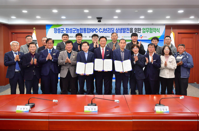 [전남=프레스뉴스] 차윤기 기자= 전남 장성군이 지난 3일 장성군농협통합RPC(알피씨), CJ(씨제이)브리딩과 식량산업 발전을 위한 업무협약을 체결했다. 장성산 식량작물의 원활한 공급과 상생 발전을 도모하는 데 목적이 있다.