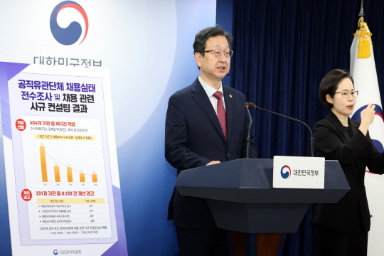 | ▲정승윤 국민권익위원회 부위원장 겸 사무처장이 6일 오전 정부서울청사에서 2023년 공직유관단체 채용 실태 전수조사 및 사규 컨설팅 결과를 발표하고 있다. (사진= 뉴스1) |