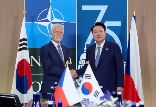 ▲윤 대통령이 지난 7월 미국 워싱턴DC에서 열린 북대서양조약기구(NATO·나토) 회의에서 페트르 파벨(왼쪽) 체코 대통령과 악수하고 있다.(사진=대통령실) |