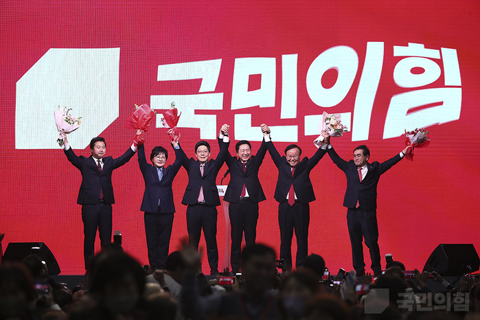 ▲국민의힘 김기현 신임 당 대표가 8일 오후 제3차 전당대회에서 최고위원들과 인사하고 있다. 왼쪽부터 장예찬, 조수진, 김병민, 김기현, 김재원, 태영호.(사진=국민의힘) |