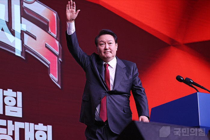 | ▲윤 대통령이 8일 국민의힘 전당대회에서 축사 전 참석자들을 향해 인사하고 있다.(사진=국민의힘) |
