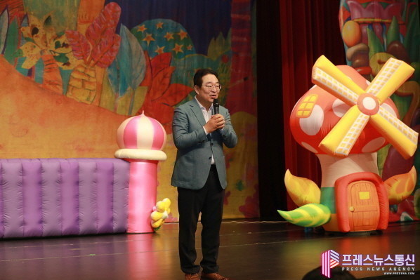 ▲황규철 옥천군수가 8일 옥천문화예술회관에서 열린 ‘얼음별 치카와 지구별 양치대장’ 어린이 인형극 행사에서 인사말을 하고 있다.(사진=옥천군) |