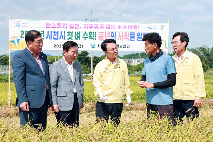 이번 수확은 지역에서 가장 빠른 벼베기 행사로, 사천시 농업기술센터, 농협, 지역 농업인 등 20여 명이 참여해 수확과 함께 조기재배 과정 설명회를 진행했다.