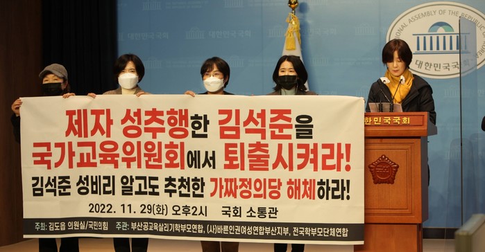 또 “부도덕한 김석준이 버젓이 국가교육위원회 위원 자리에 있는 것에 학부모단체와 여성인권단체들은 말로 표현할 수 없는 수치심과 분노를 느낀다”고 일갈했다.