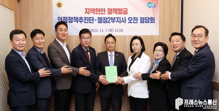 의정정책추진단 윤태길(국힘, 하남1)·정윤경(민주, 군포1) 공동단장을 비롯한 추진단 위원 8명은 정담회 자리에서 오후석 행정2부지사에게 도청 실·국별 소관 지역현안 및 정책과제 추진현황 등을 논의하고, 추진단 출범 이후 열 달 동안 진행된 정책제안 과정이 담겨 있는 정책 제안 자료집을 전달했다.