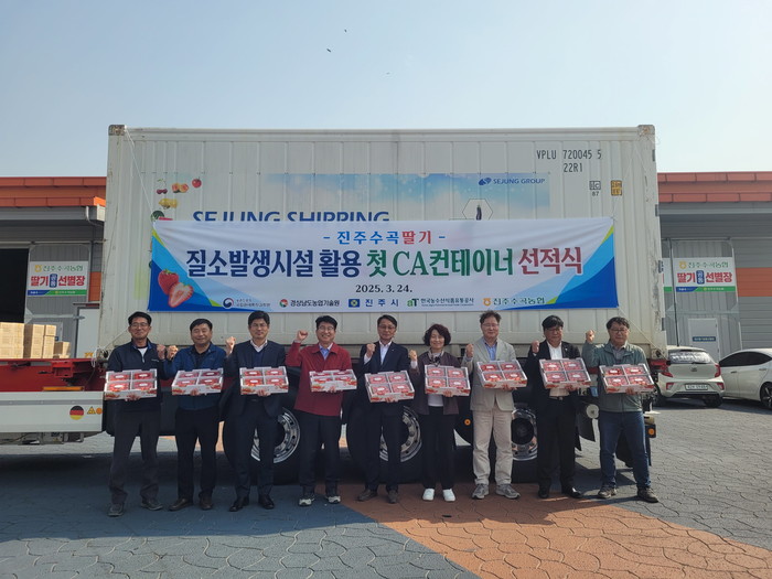 | ▲진주시는 24일 진주수곡농협수출농단 선별장에서 CA 컨테이너를 활용한 금실딸기 첫 선박 수출 선적식을 가졌다. (사진=진주시) |