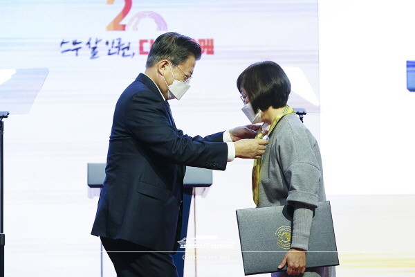 ▲문 대통령이 25일 명동성당에서 열린 국가인권위원회 설립 20주년 기념식에서 최영미 한국가사노동자협회 대표에게 대한민국 인권상을 수여 하고 있다. (사진= 청와대) |