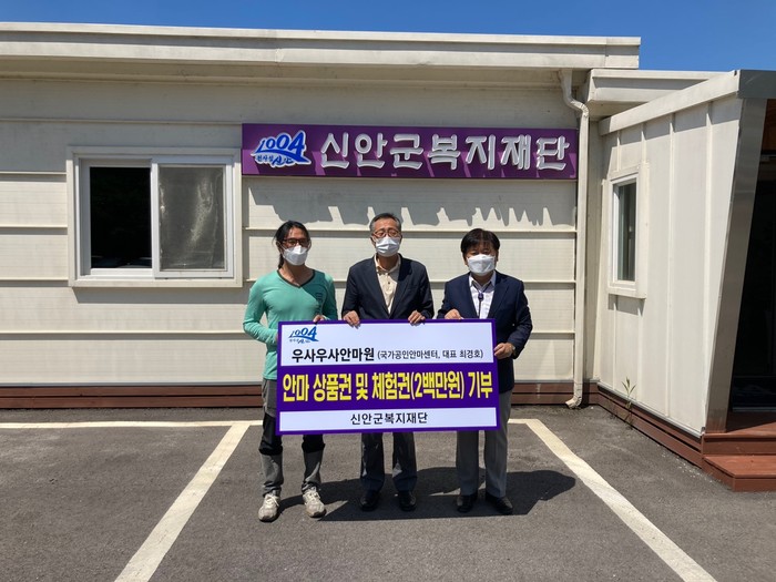 | ▲ 신안군복지재단, 우사우사안마원으로부터 200만원 상당의 상품권 및 체험권을 기탁받았다.(신안군 제공) |