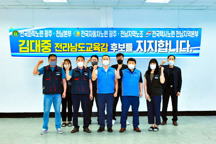 [전남=프레스뉴스] 강래성 기자= 김대중 전남교육감 후보에 대한 지지선언이 봇물을 이루고 있는 가운데 전국 화학연맹 광주·전남본부, 전국 택시연맹 광주전남본부, 전국 자동차연맹 광주·전남본부 등이 25일 잇따라 김 후보 지지선언을 했다.