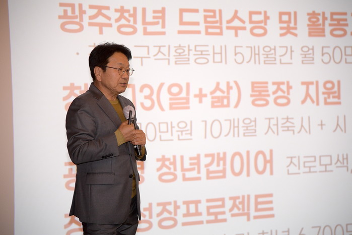 강기정 광주광역시장은 28일 저녁 전남대학교에서 현장대화 ‘청춘이 묻고 시장이 답하다’를 진행, 청년들의 정책 제안에 귀를 기울였다. 강 시장은 이날 청년들이 제안한 정책들에 대해 자신의 생각과 광주시 추진 상황 등을 설명했다.