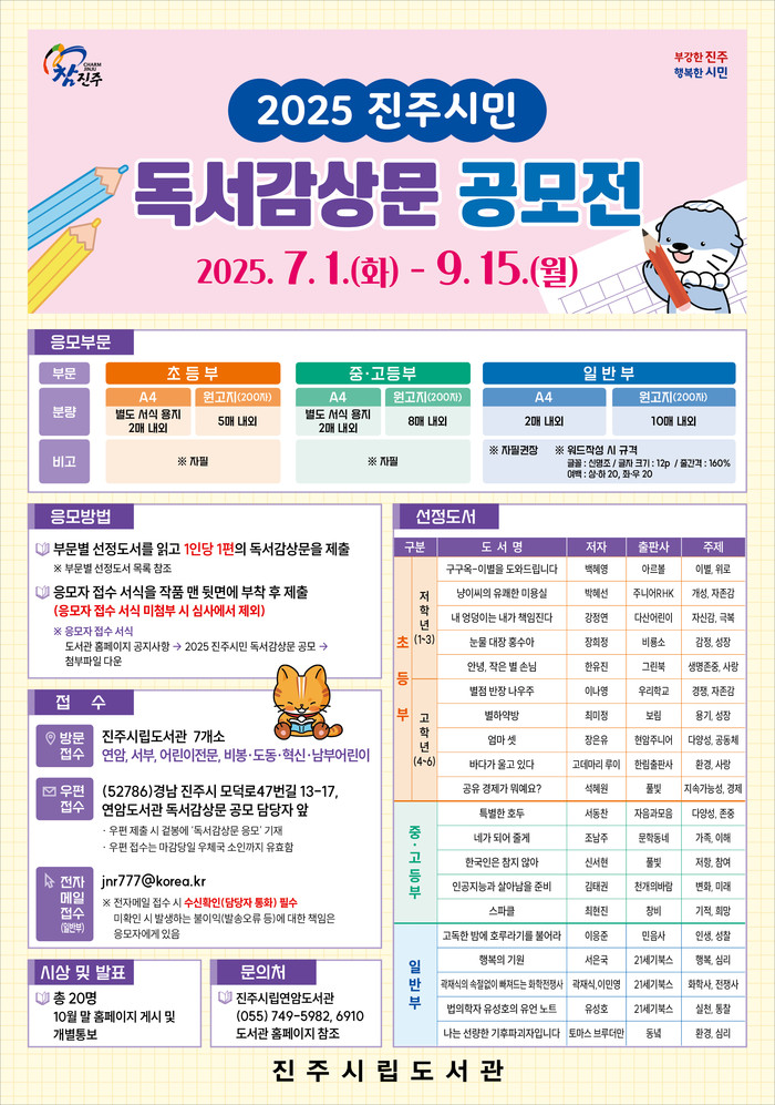 응모자는 부문별 지정 도서 중 한 권을 읽고 감상문을 작성해 제출하면 된다. 제출 방법은 시립도서관 7곳 방문 또는 우편 접수이며, 일반부는 이메일 접수도 가능하다.