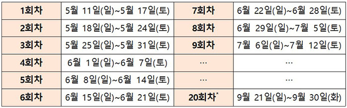 | ▲회차 운영 일정 (마지막 회차인 20회차는 행사 종료일인 9월 30일에 맞춰 10일간 운영 예정) |