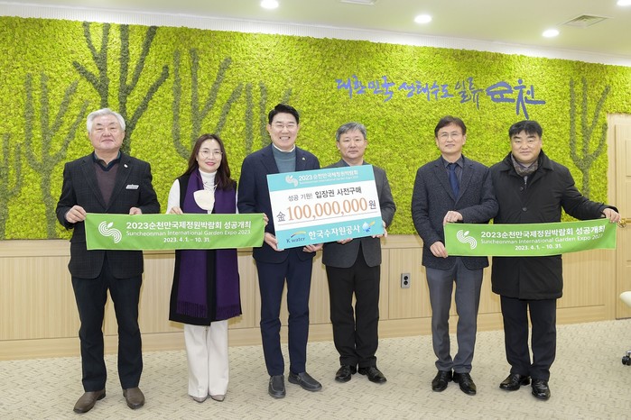 [전남=프레스뉴스] 강래성 기자=(재)순천만국제정원박람회조직위원회(이사장 노관규)가 지난 26일 시장실에서 2023순천만국제정원박람회 성공 개최를 응원하며 한국수자원공사(사장 박재현)가 1억 원의 입장권을 사전 구매했다고 밝혔다.