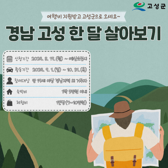 ‘경남 고성 한 달 살아보기’ 프로그램은 만 19세 이상 경남 지역 외 거주자를 대상으로 하며, 최소 5박 이상 29박 이하 고성군에 머무르며 다양한 관광자원·지역 문화예술·역사 자원 및 축제 등을 자유로이 체험하고 개인 SNS을 통해 체험 내용을 홍보하면 숙박비와 체험비 등의 활동비를 지원받을 수 있다. 경남도 핵심과제인 ‘청년 특별도’와 연계하여 청년(19~34세)의 경우와 SNS 크리에이터 및 인플루언서, 외국인·재외동포의 경우에는 우선 선발의 우대사항이 적용된다.
