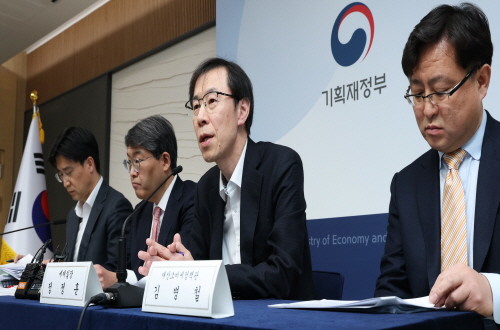 | ▲정정훈 기획재정부 세제실장(오른쪽 두번째)이 지난 11일 세종시 정부세종청사에서 유산취득세 도입 방안 내용을 발표하고 있다.(사진= 뉴스1) |
