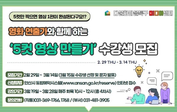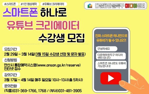 이들 과정은 3월 14일까지 안산시 통합예약시스템을 통해 안산시 거주 내·외국인 누구나 신청할 수 있으며, 수강료 및 강의에 필요한 물품은 미디어센터에서 무료로 지원한다.