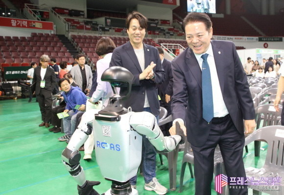 ▲지난 5월 31일 안양스마T움 축제에서 최대호 안양시장(오른쪽 첫번째)이 휴머노이드 로봇과 악수를 하고 있다.(사진=안양시) |