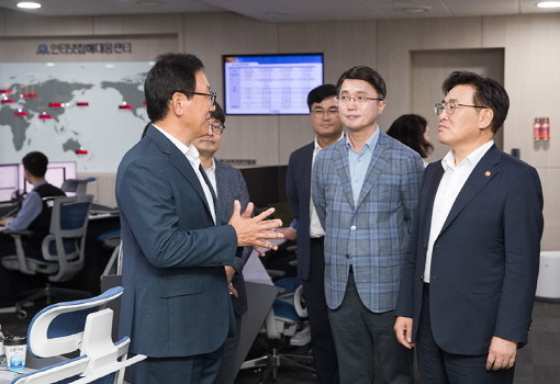 | ▲유상임 과학기술정보통신부 장관(맨 오른쪽)이 서울 송파구 한국인터넷진흥원 인터넷침해대응센터를 방문해 사이버 위협 대응현황과 상시 대응체계를 점검하고 있다. (사진= 뉴스1) |