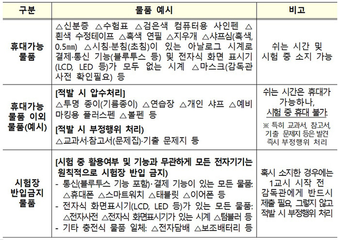 | ▲시험 중 휴대 가능 물품 및 반입금지 물품 종류. |