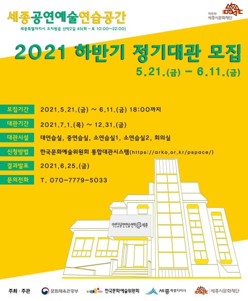 [프레스뉴스] 강기동= 세종시문화재단은 2021년도 하반기 ‘세종공연예술연습공간’ 정기대관을 모집한다. 이번 정기대관 대상기간은 7월부터 12월까지 총 6개월간이다.