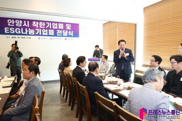 [프레스뉴스] 장현준 기자= 안양시는 16일 오전 11시 30분 관내 음식점에서 지역사회와 이웃을 위해 나눔을 실천한 14개 기업을 대상으로 간담회와 함께 ‘착한기업’ 및 ‘이에스지(ESG)나눔기업’ 감사패 전달식을 가졌다.