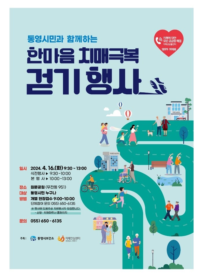 이번 걷기행사는 치매예방에 좋은‘걷기’를 실천하면서 치매극복을 기원하고, 치매예방 정보 공유 등 치매 친화적 환경을 조성하기 위함이며, 치매환자와 가족, 노인시설 이용자 등 치매에 관심이 있는 통영시민 누구나 참여가 가능하다.