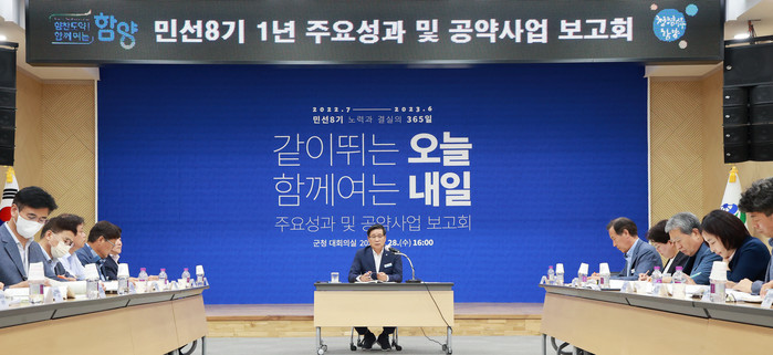 함양군은 지난 28일 오후 군청 대회의실에서 ‘민선 8기 1년 주요성과 및 공약사업 보고회’를 개최하고 지난 1년간 군정의 주요성과와 반성, 공약사업 점검, 향후 3년간 추진할 중점 사업과 정책을 공유했다.