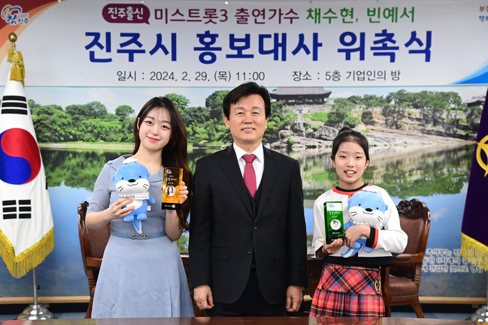 [프레스뉴스] 정호일 기자= TV조선 ‘미스트롯 3’에 출연 중인 진주 출신 가수 채수현, 빈예서가 29일 시청 5층 기업인의 방에서 진주시 홍보대사로 위촉됐다.