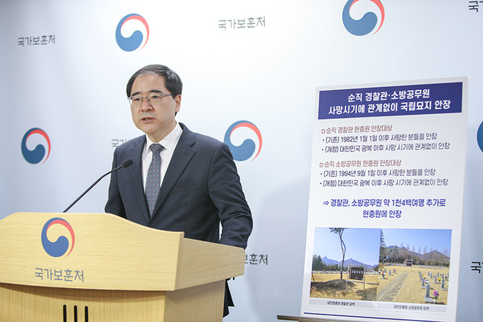 박민식 보훈처장은 “이번 국립묘지법 개정으로 국민의 일상을 지키는 제복근무자의 사기와 자긍심을 높이고 이를 통해 대국민 안전 서비스의 질적 향상으로 이어져 제복근무자에 대한 존중 문화가 확산될 것으로 기대한다”며 “앞으로도 각종 재난 현장에서 몸 바쳐 희생·헌신한 제복근무자들을 예우하는 일류보훈을 실현하는데 역점을 두고 업무를 추진하겠다”고 말했다.