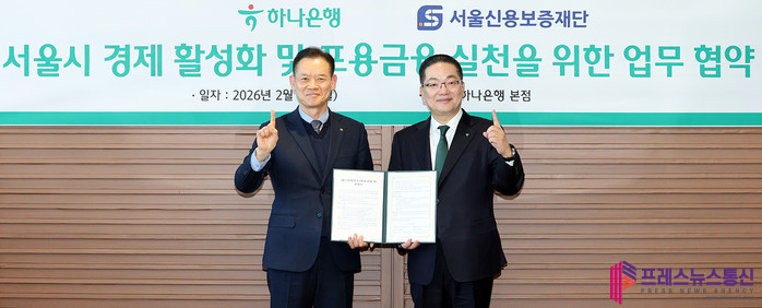 [프레스뉴스] 류현주 기자= 하나은행(은행장 이호성)은 2일 오후 은행권 최초로 서울신용보증재단(이사장 최항도)과 『서울시 경제 활성화 및 포용금융 실천을 위한 업무협약』을 체결하고, 소상공인에 대한 정책지원 업무의 효율성 향상 및 지역경제 활성화를 위해 상호 협력키로 했다고 밝혔다.
