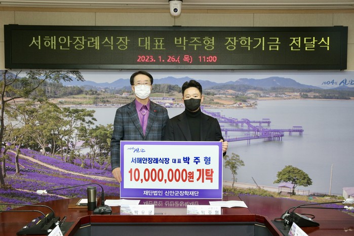 | ▲서해안장례식장 박주형 대표는 26일 지역인재육성기금 1천만원을 (재)신안군장학재단(이사장 박우량)에 전달했다./신안군 제공 |