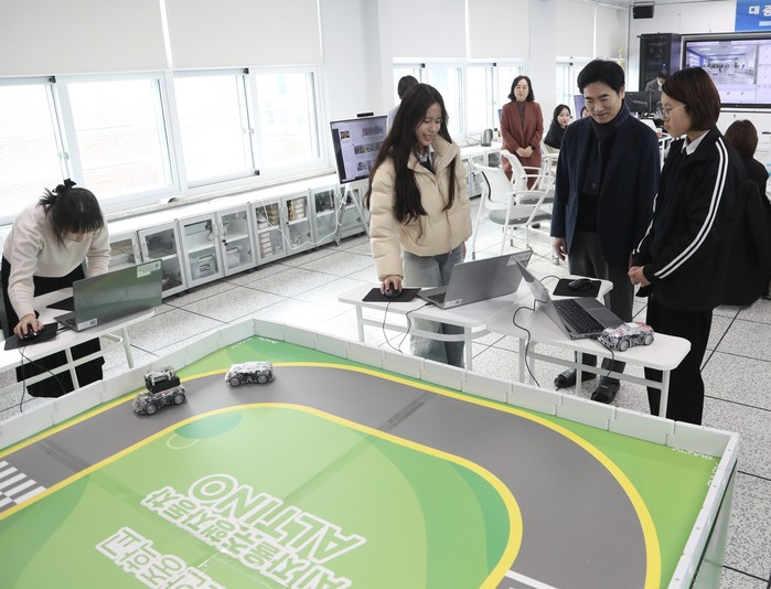 | ▲김대중 교육감이 노안중 미래교실에서 학생들의 AI자율주행자동차 시연을 보고 있다./전남교육청 제공 |