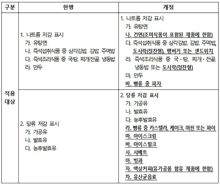 이에 나트륨 저감 표시 추가 대상에 건면(조미식품 포함 제품에 한함), 즉석섭취식품 중 도시락(정찬형)·햄버거·샌드위치, 즉석조리식품 중 도시락(정찬형), 빵류 중 피자 등 6종을 포함시켰다.