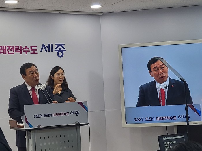 ▲ 최민호 시장이 27일 개최된 언론브리핑에서 발표를 하고 있다(사진=김교연기자) |